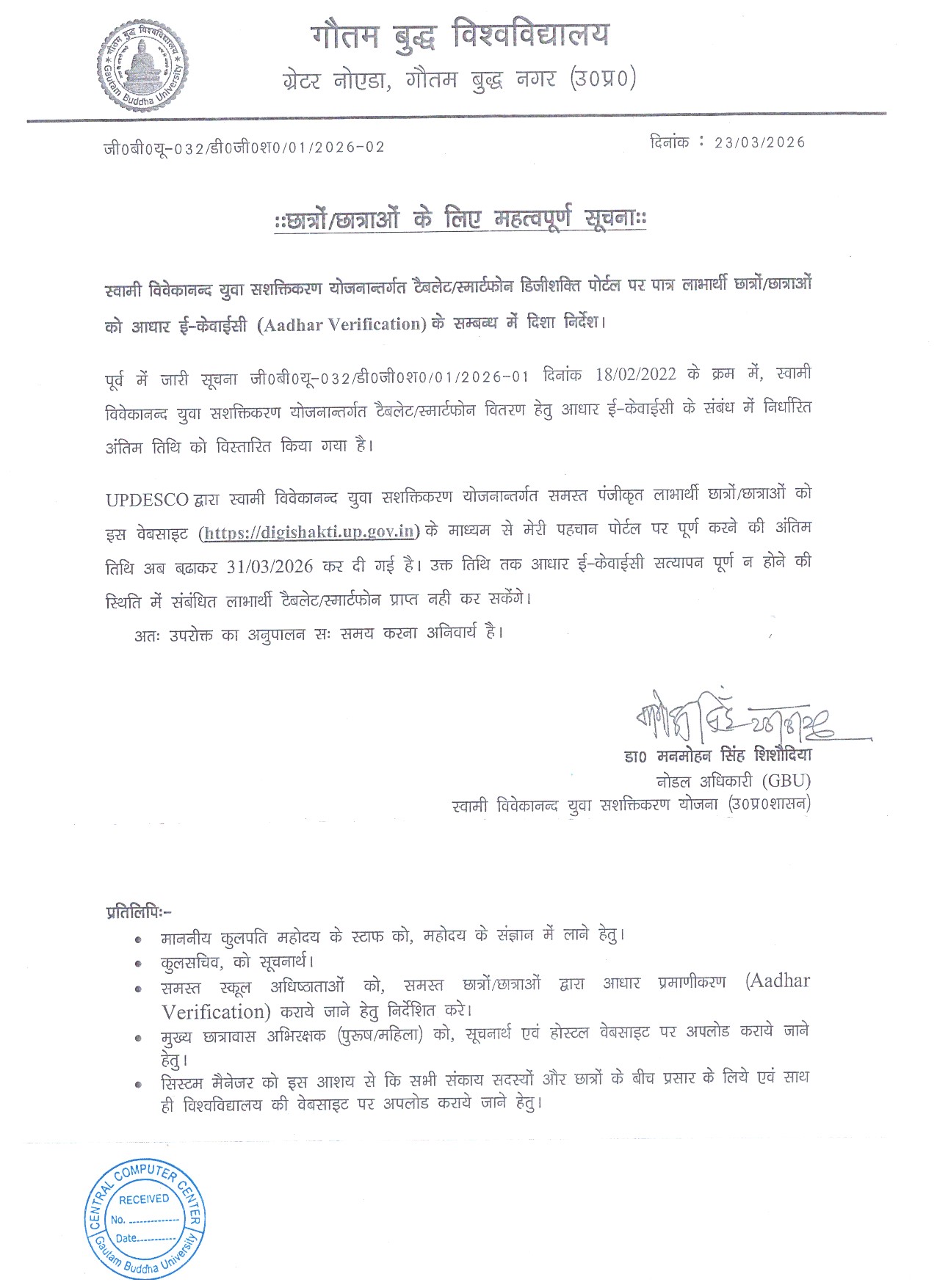 - Office Order dated GBU/Admn./2.3/2026-454 (28-02-2026 ).
