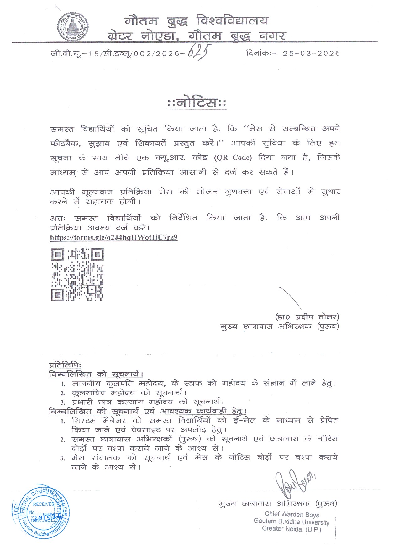 - Notice for Mess related feedback, complaints and suggestion (30-03-2026 ).