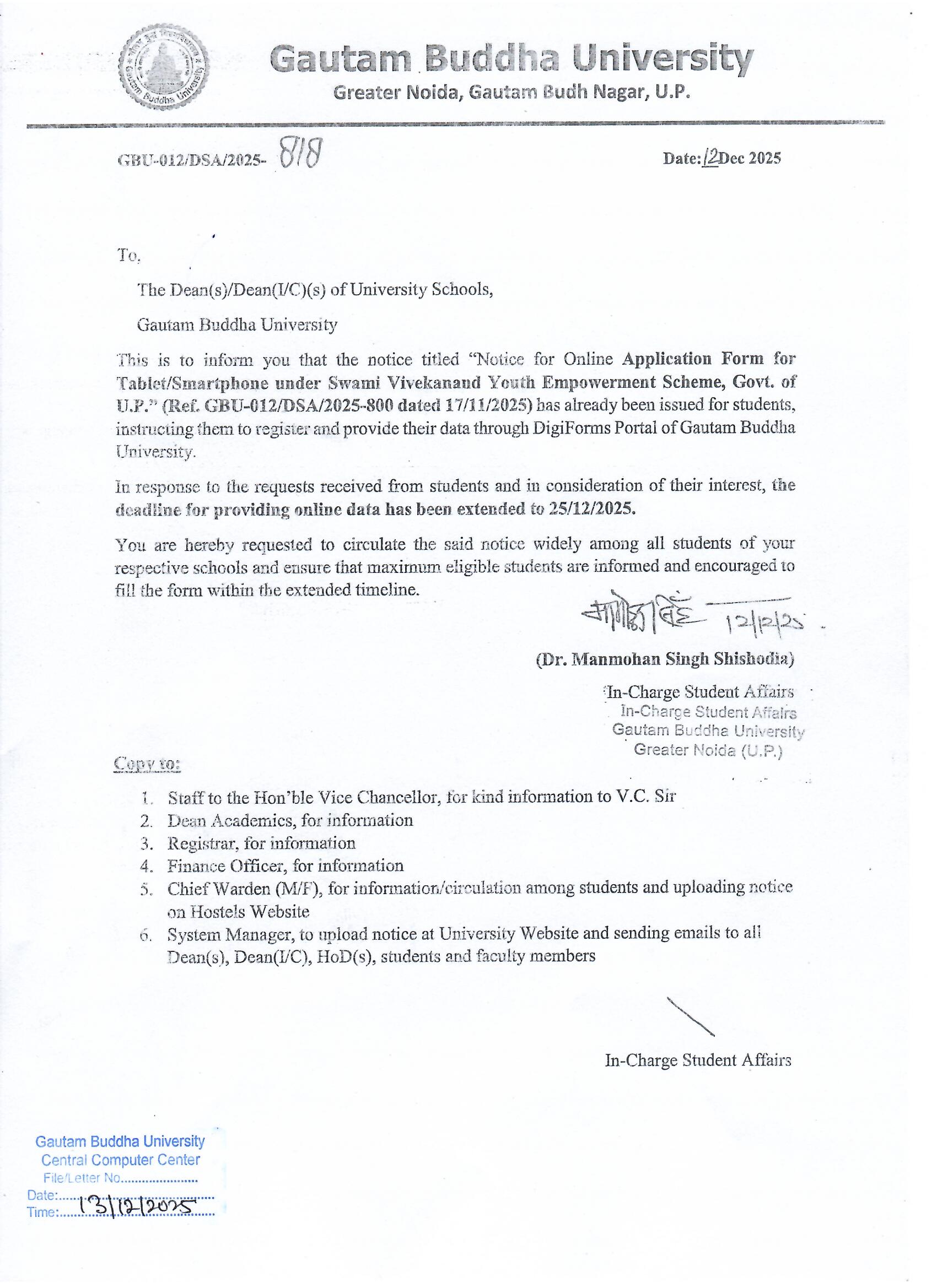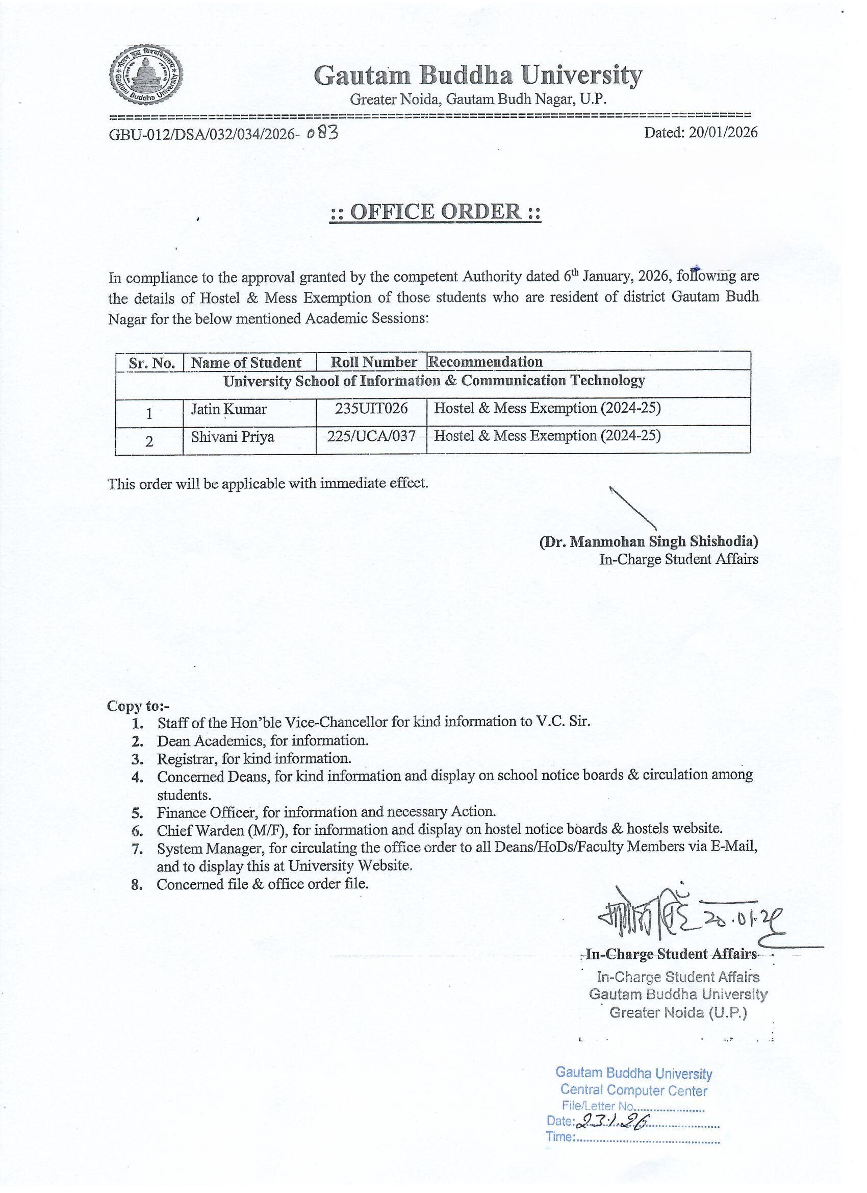 Office Order for Hostel and Mess Exemption for doing dissertation/Project work outside Gautam Buddha University during Academic Session 2024-25