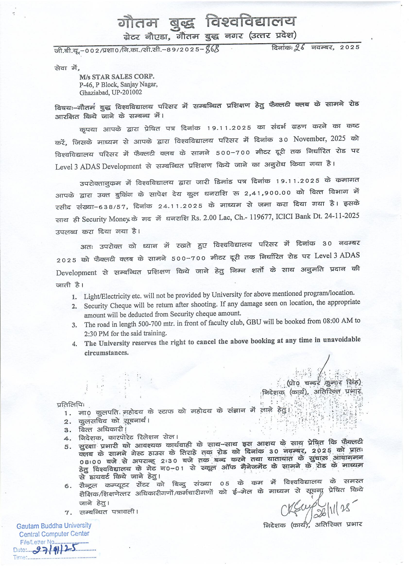 Regarding the reservation of the road in front of the Faculty Club for examination-related purposes within the Gautam Buddha University campus